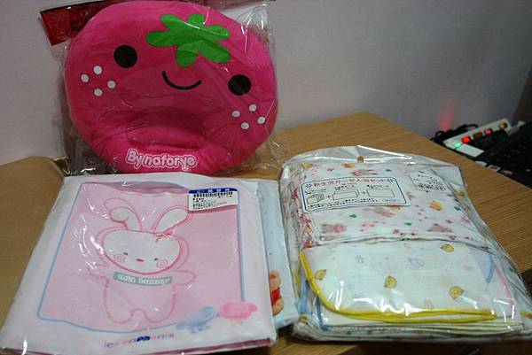 紗布巾:贈品紗布口水巾數條(FREE)、以及小型口水巾、中型澡巾兩條跟大型浴巾一條的組合是小姑送的