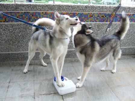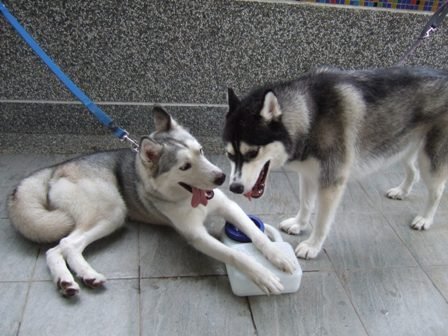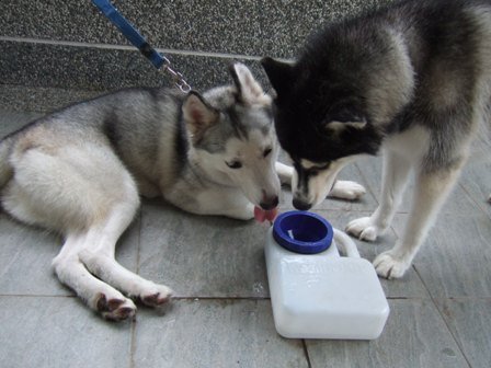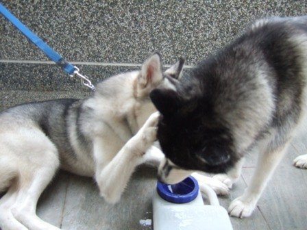 妹妹和小妞剛開始可以和平喝水,後來不知道怎麼了兩個鬧翻了~~ (看卡卡鼻子都皺起來了...)