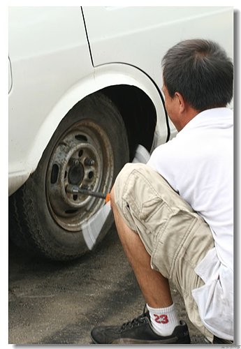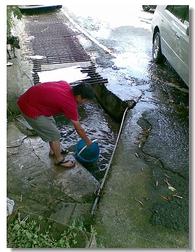 在水的下游洗車的阿拔一直滴咕說:水那麼混濁阿是要怎麼洗車拉