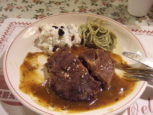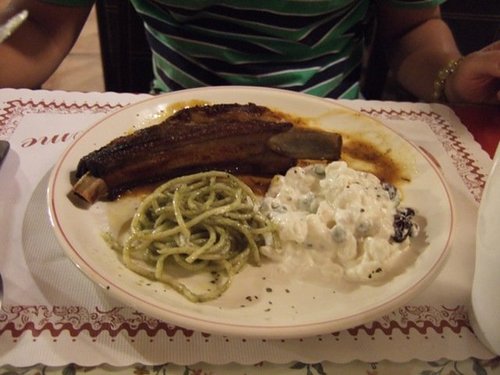 牛排,很像全熟的牛排再加熱微波過義大利麵冷冷的,另外是馬鈴薯沙拉不是我再網路上面看到的生菜沙拉,晚餐真的是好失望...當然,這照片是我們吃了伊兩口才想到沒拍照,比剛上桌難看一點點。因為肚子很餓所以即使咬不下去也是要硬吞阿囧rz