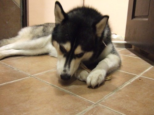 剩下的一點肉肉還有豬肋骨頭過水後給尼卡吃 (如果是雞骨頭妮卡也不用吃了 >"<)