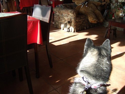 喵喵在照日光浴,卡卡在想要怎麼過去玩耍
