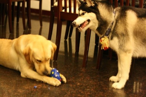 九點多帶著妮卡去找小米妹妹玩,兩個人一直繞著餐廳跑,妮卡撞來撞去還把餐廳雪白牆壁都弄髒了