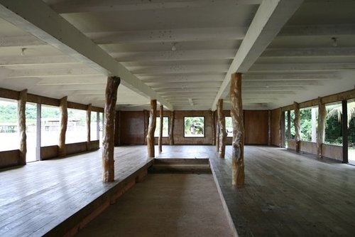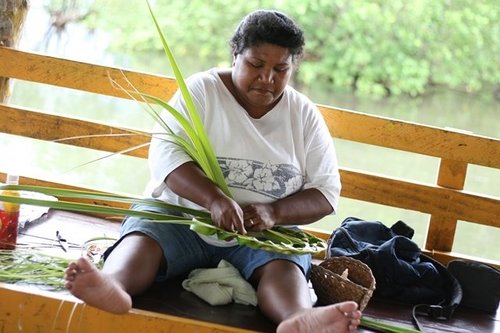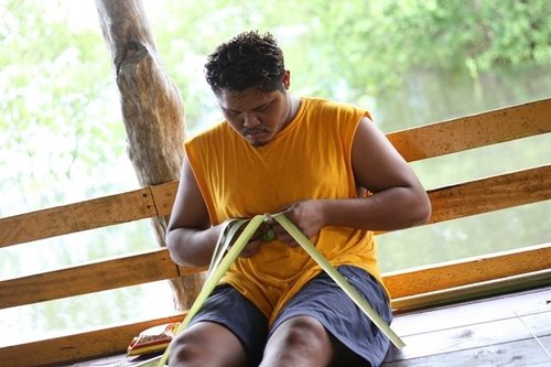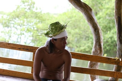 用完餐點,我們先步行到約200公尺附近的涼亭裡面,有位媽媽用葉子編織成帽子送給女生