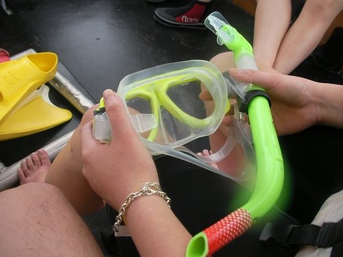 再來,要準備下水囉。第一步要做的"面鏡除霧"就是在面鏡的地方大吐兩陀口水,然後再用海水沖洗